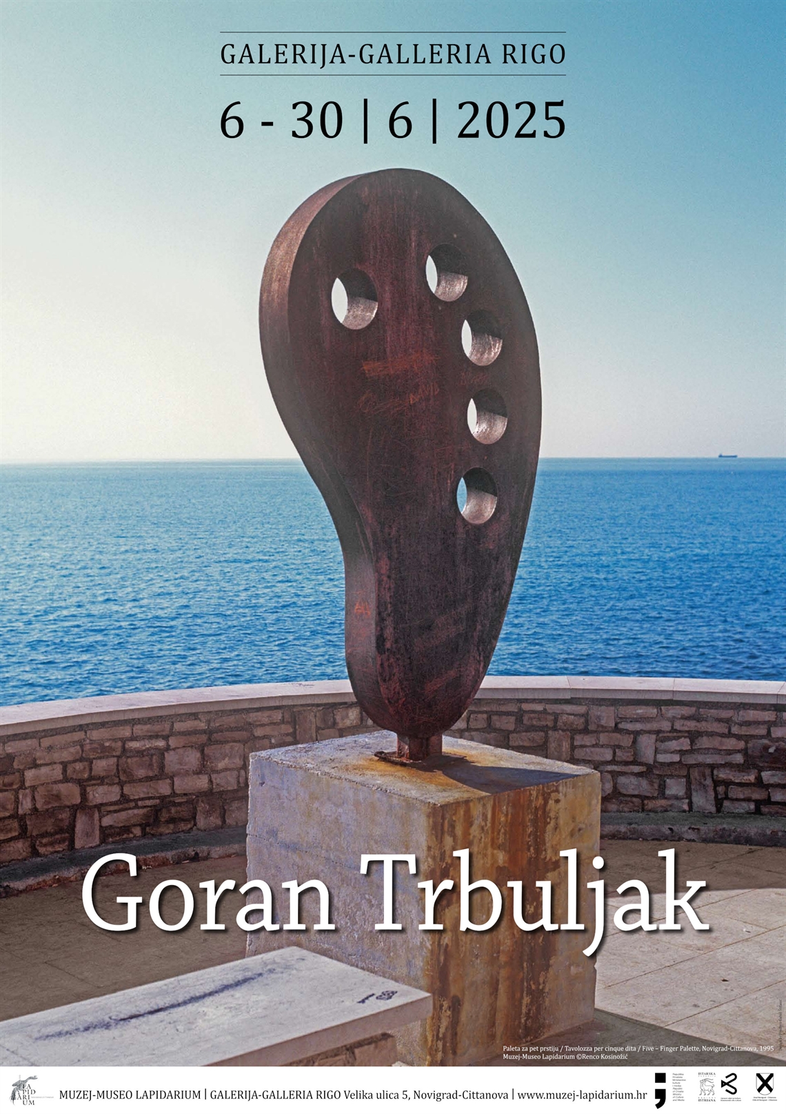 Gubaš Štifanić, Fedora (dizajner) Gušt dizajn (dizajner) Kosinožić, Renco (fotograf) Simbol Grafika (tisak) 2025. 2025 13826 papir cjelina: š = 48cm;v = 68cm Karigador Novigrad (Cittanova) Pula Muzej - Museo Lapidarium Goran Trbuljak Goran Trbuljak Galerija - Galleria Rigo 6. - 30.6.2025. digitalni tisak izložba plakat Zbirka muzejskih plakata Plakat za izložbu Gorana Trbuljaka u lipnju 2025. u Galeriji Rigo. Umjetnik je napravio „remake“ izložbe u istoj galeriji koja je održana tri desetljeća ranije. Na plakatu se nalazi njegova monumentalna čelična skulptura, ujedno i jedina javna skulptura, „Paleta za pet prstiju“, koja je bila postavljena u Novigradu, a danas se nalazi u Zbirci Rigo.