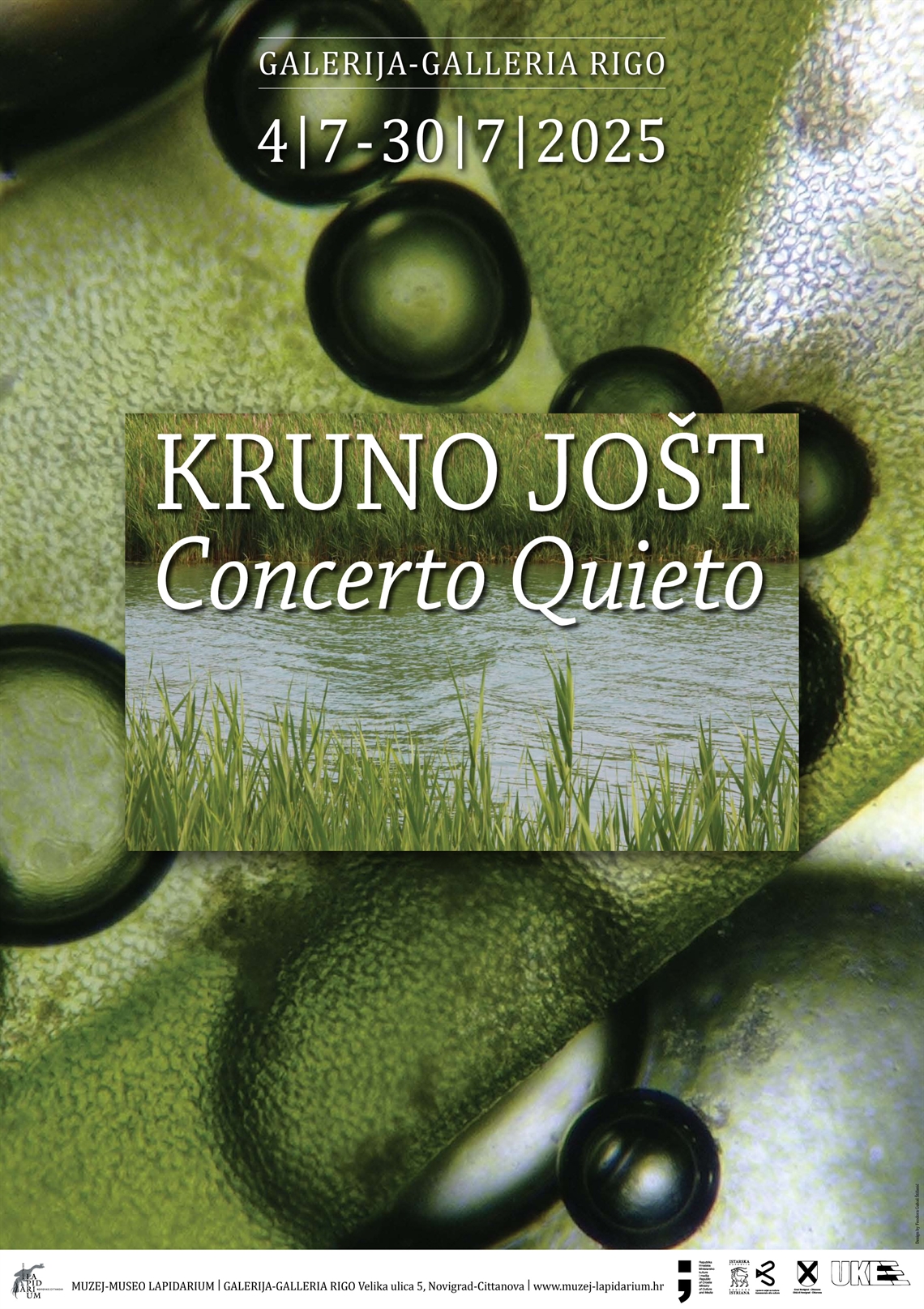 Gubaš Štifanić, Fedora (dizajner) Gušt dizajn (dizajner) Jošt, Kruno (fotograf) Tiskara NOVA (tisak) 2025. 2025 13828 papir cjelina: š = 48cm;v = 68cm Galižana Novigrad (Cittanova) Pula Muzej - Museo Lapidarium Kruno Jošt Kruno Jošt 4.7. – 30.7.2025. Concerto Quieto Galerija - Galleria Rigo digitalni tisak izložba plakat Zbirka muzejskih plakata Plakat za izložbu multimedijskog umjetnika Krune Jošta (1973.) u Galeriji Rigo 2025. godine. Naziv izložbe „Concerto Quieto“ izveden je iz talijanskog naziva za istarsku rijeku Mirnu, na kojoj je umjetnik napravio svojevrsno znanstveno-umjetničko istraživanje. Prikupio je uzorke vode i sedimenta, snimio mikroorganizme i pridružio im zvučne kompozicije koje utječu na povećanje ili smanjenje broja mikroorganizama.