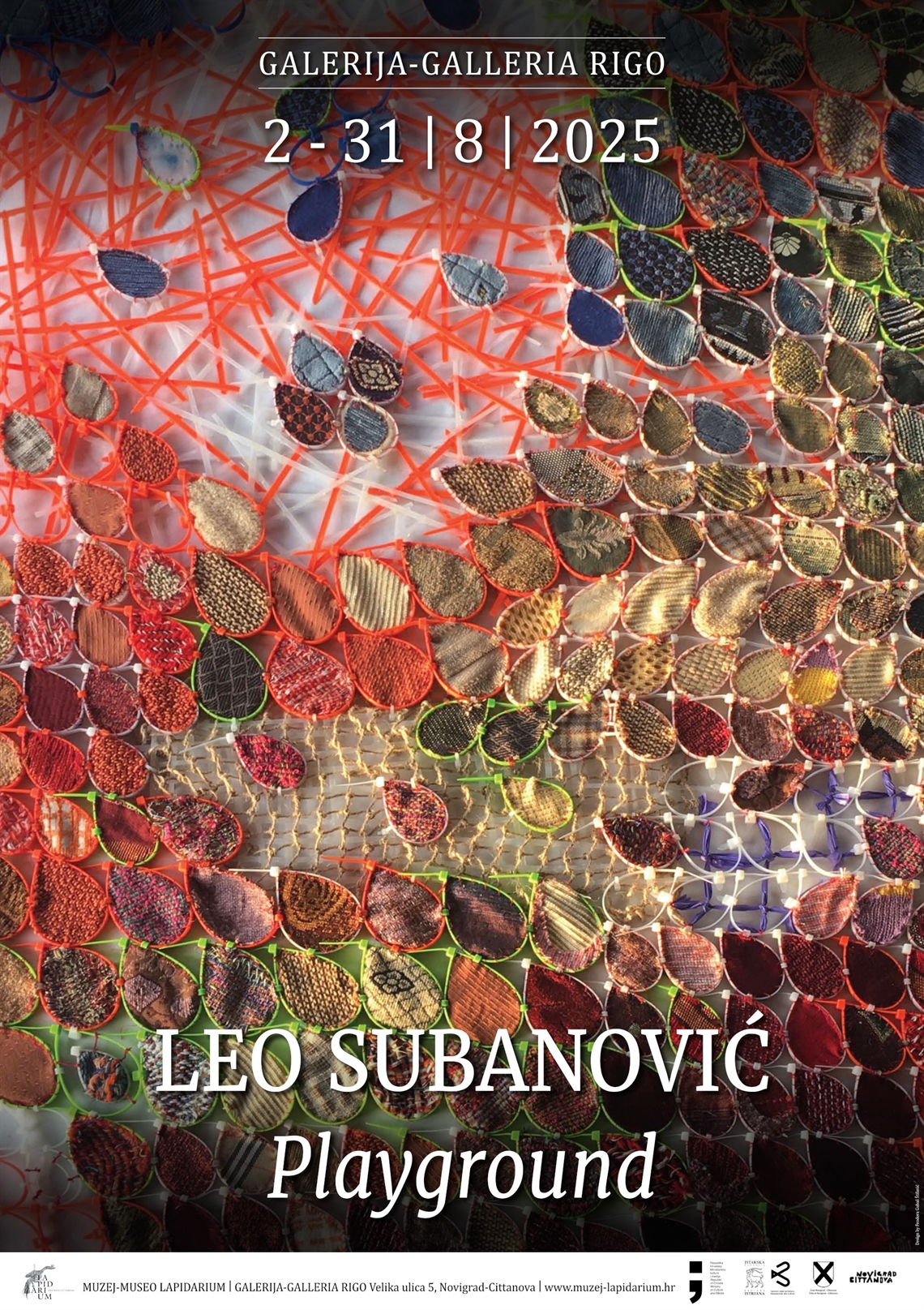 Gubaš Štifanić, Fedora (dizajner) Gušt dizajn (dizajner) Subanović, Leo (fotograf) Tiskara NOVA (tisak) 2025. 2025 13831 papir cjelina: š = 49cm;v = 68cm Galižana Novigrad (Cittanova) Pula Muzej - Museo Lapidarium Leo Subanović Leo Subanović Galerija - Galleria Rigo Playground 2.-31.8.2025. digitalni tisak izložba plakat Zbirka muzejskih plakata Plakat za izložbu tekstilnog umjetnika Lea Subanovića (1999.) otvorenu početkom kolovoza 2025. u Galeriji Rigo. Izložba je organizirana povodom dodjele nagrade i 30. godišnjice Galerije Rigo. Nagrada je predviđena za jednog od finalista izložbe Zlatna lubenica koja seodržala u Muzeju suvremene umjetnosti Istre.