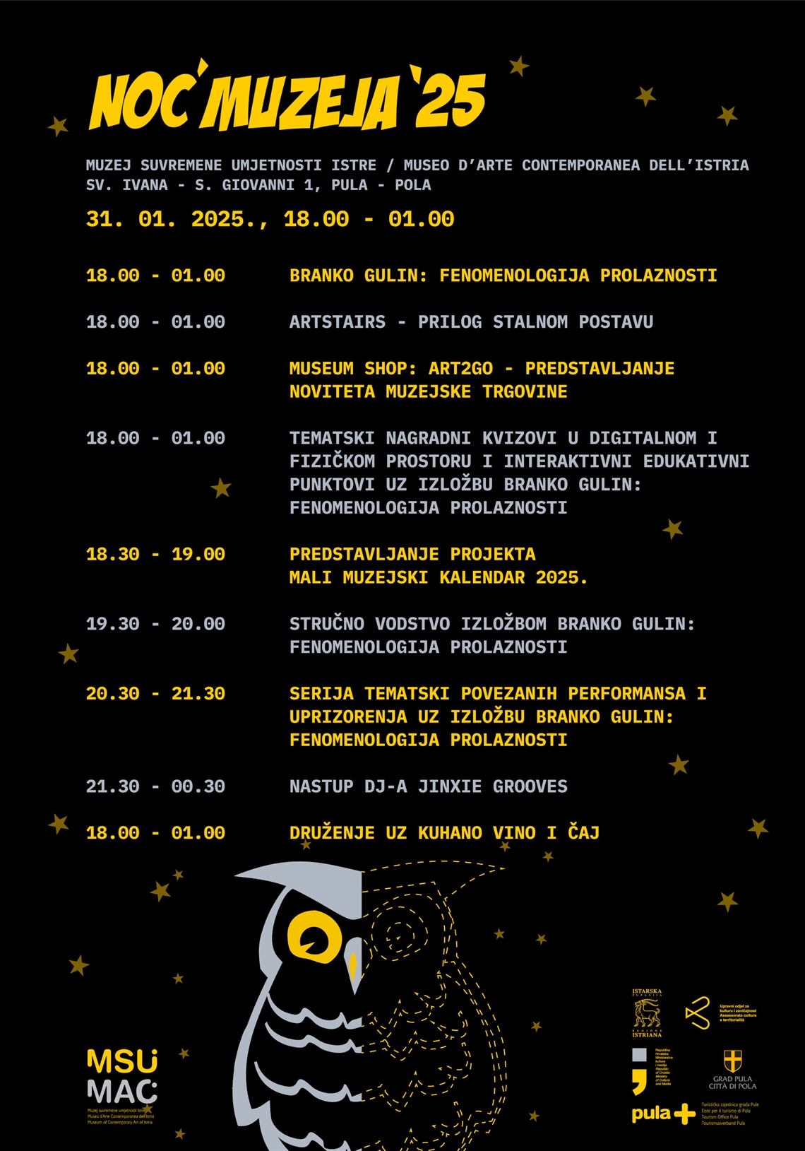 Gašparić, Iva (dizajner) Technic team d.o.o. (tisak) 2025. 2025 13989 papir cjelina: š = 70cm;v = 100cm Galižana Pula Muzej suvremene umjetnosti Istre – Museo d' arte contemporanea dell' Istria Noć muzeja '25 Noć muzeja '25 Muzej suvremene umjetnosti Istre, Sv. Ivana 1, Pula Museo d'arte contemporanea dell'Istria, S. Giovanni 1, Pola 31.01.2025., 18.00 - 01.00 digitalni tisak manifestacija plakat Zbirka muzejskih plakata Plakat povodom Noći muzeja 31. siječnja 2025. u Muzeju suvremene umjetnosti Istre s programom događanja koja uključuju izložbe, kvizove, stručno vodstvo, performans, glazbeni program i drugo.