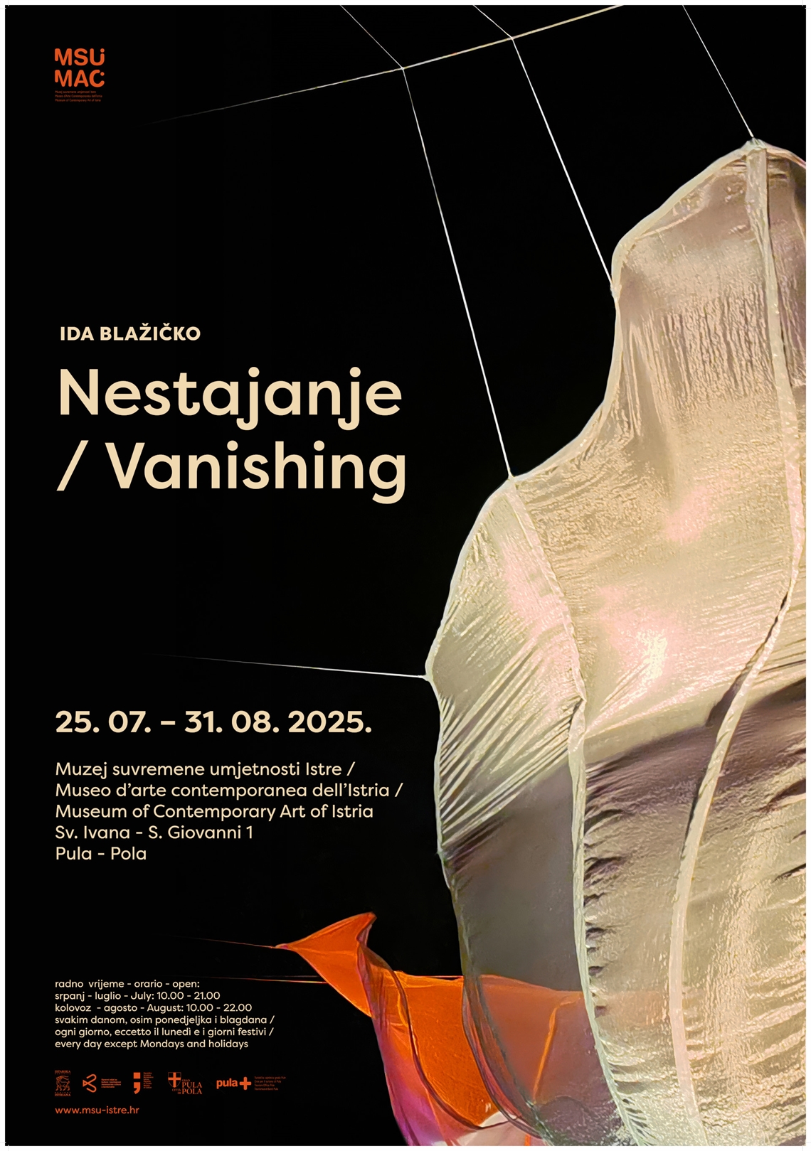 Blažičko, Ida (fotograf) Nalić, Tihana (dizajner) Technic team d.o.o. (tisak) 2025. 2025 13990 papir cjelina: š = 70cm;v = 100cm Galižana Pula Muzej suvremene umjetnosti Istre – Museo d' arte contemporanea dell' Istria Ida Blažičko Ida Blažičko Muzej suvremene umjetnosti Istre, Sv. Ivana 1, Pula Museo d'arte contemporanea dell'Istria, S. Giovanni 1, Pola 31.01.2025., 18.00 - 01.00 Nestajanje Vanishing 25.07. - 31.08.2025. digitalni tisak izložba plakat Zbirka muzejskih plakata Plakat povodom samostalne izložbe kiparice Ide Blažičko u Muzeju suvremene umjetnosti Istre u ljeto 2025. Ovo je njezina prva samostalna izložba u ovome muzeju. Riječ je o multimedijskoj instalaciji koja uključuje i zvuk, a referira se na nestajanje prirodnih staništa i biološke raznolikosti.