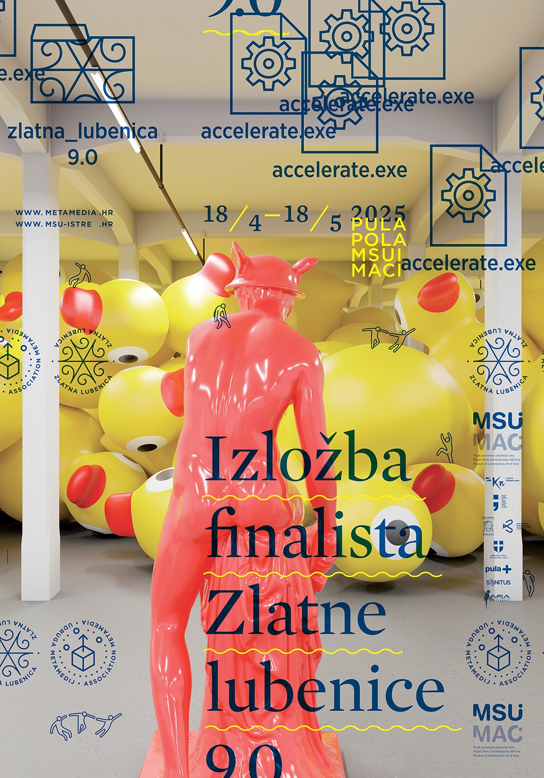 Šuran, Oleg (dizajner, fotograf) Technic team d.o.o. (tisak) 2025. 2025 13992 papir cjelina: š = 70cm;v = 100cm Galižana Pula Muzej suvremene umjetnosti Istre – Museo d' arte contemporanea dell' Istria Izložba finalista Zlatne lubenice 9.0 Izložba finalista Zlatne lubenice 9.0 Muzej suvremene umjetnosti Istre, Sv. Ivana 1, Pula Museo d'arte contemporanea dell'Istria, S. Giovanni 1, Pola accelerate.exe 18.4. – 18.5.2025. Udruga Metamedij Metamedij Association digitalni tisak izložba plakat Zbirka muzejskih plakata Plakat za izložbu finalista 9. po redu dodjele nagrade Zlatna lubenica u Muzeju suvremene umjetnosti Istre od 18. travnja do 18. svibnja 2025. Izložba je ostvarena u suradnji s udrugom Metamedij, a otvorena je proglašenjem pobjednika - nagradu je osvojio Pavle Mijuca.