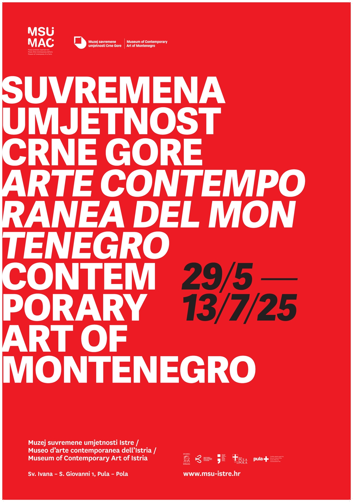 Nalić, Tihana (dizajner) Technic team d.o.o. (tisak) 2025. 2025 13993 papir cjelina: š = 70cm;v = 100cm Galižana Pula Muzej suvremene umjetnosti Istre – Museo d' arte contemporanea dell' Istria Suvremena umjetnost Crne Gore Suvremena umjetnost Crne Gore Muzej suvremene umjetnosti Istre, Sv. Ivana 1, Pula Museo d'arte contemporanea dell'Istria, S. Giovanni 1, Pola Contemporary Art of Montenegro Arte contemporanea del Montenegro 29.5. – 13.7.2025. digitalni tisak izložba plakat Zbirka muzejskih plakata Plakat za izložbu nastalu u suradnji Muzeja suvremene umjetnosti Istre i Muzeja savremene umjetnosti Crne Gore. Na izložbi su od 25. svibnja do 13. srpnja 2025. u Muzeju suvremene umjetnosti Istre predstavljeni crnogorski suvremeni umjetnici - Ana Aleksić, Zdravko Delibašić Beli, Milena Mijović Durutović, Roman Đuranović, Aleksandar Đuravčević, Milena Jovićević, Gordana Kuč, Brano Mandić, Marko Marković, Teodora Nikčević, Aleksandar Ostojić, Ivana Radovanović, Siniša Radulović, Nenad Šoškić, Jelena Tomašević, Jovana Vujović, Jovana Vujanović, Natalija Vujošević i Milica Živković.