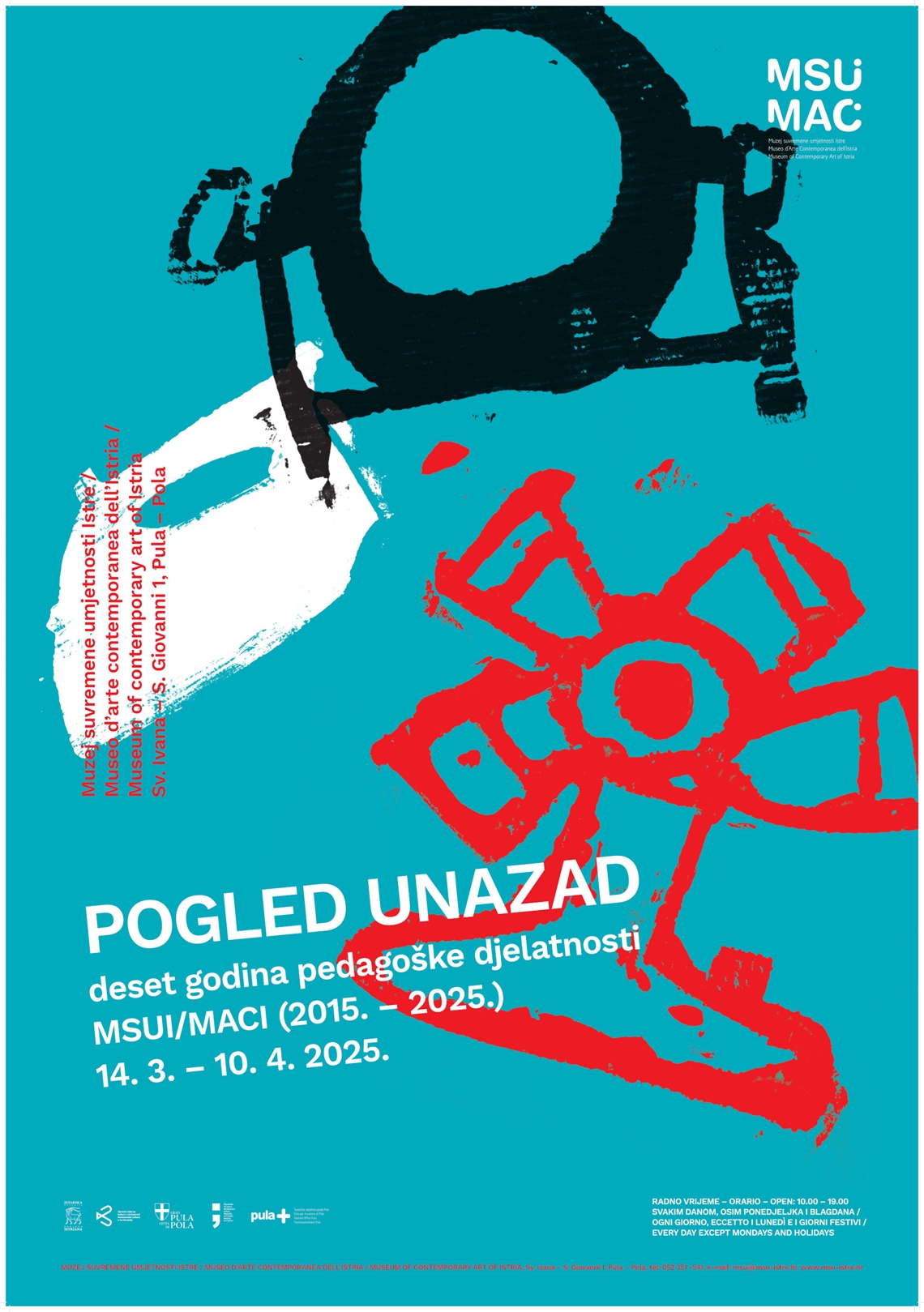 Nalić, Tihana (dizajner) Technic team d.o.o. (tisak) 2025. 2025 13994 papir cjelina: š = 70cm;v = 100cm Galižana Pula Muzej suvremene umjetnosti Istre – Museo d' arte contemporanea dell' Istria Pogled unazad Pogled unazad Deset godina pedagoške djelatnosti MSUI/MACI (2015. – 2025.) 14.3. – 10.4.2025. Muzej suvremene umjetnosti Istre, Sv. Ivana 1, Pula Museo d'arte contemporanea dell'Istria, S. Giovanni 1, Pola digitalni tisak izložba plakat Zbirka muzejskih plakata Plakat povodom izložbe u Muzeju suvremene umjetnosti Istre od 14. ožujka do 10. travnja 2025. koja posjetiteljima približila deset godina rada pedagoškog odjela ovog muzeja. Izložene su fotografije, multimedijski sadržaj i radovi s radionica, a pokrivene su aktivnosti i program poput stručnih vodstava, publikacija, radionica, kvizova te različitih manifestacija koje je Muzej pokrenuo ili sudjelovao. Za dizajn plakata korišteni su dječji radovi nastali na radionici „Muzejski suvenir“ kao otisci grafičke tehnike kartonskog tiska.