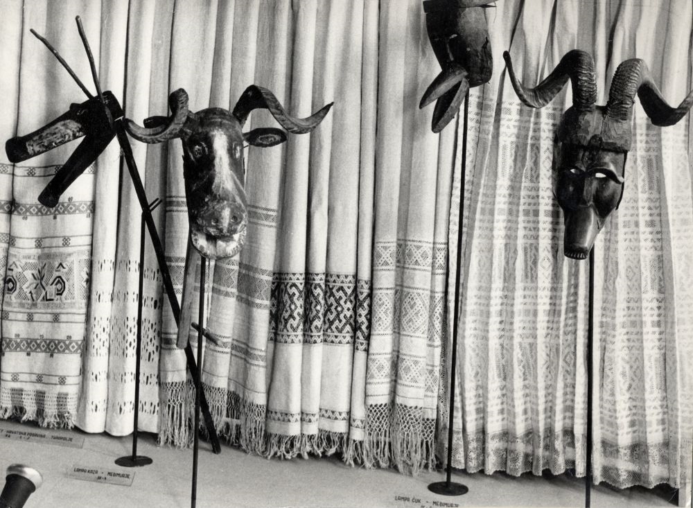 Etnografski muzej, pokladne maske 9x13 cm Vranić, Nikola Nino (fotograf) Zagreb crno-bijela fotografija Fototeka MGH549 maska izložba muzejski predmet etnografija poklade Zagreb Etnografski muzej Zagreb Pokladne maske, detalj s izložbe u Etnografskom muzeju.