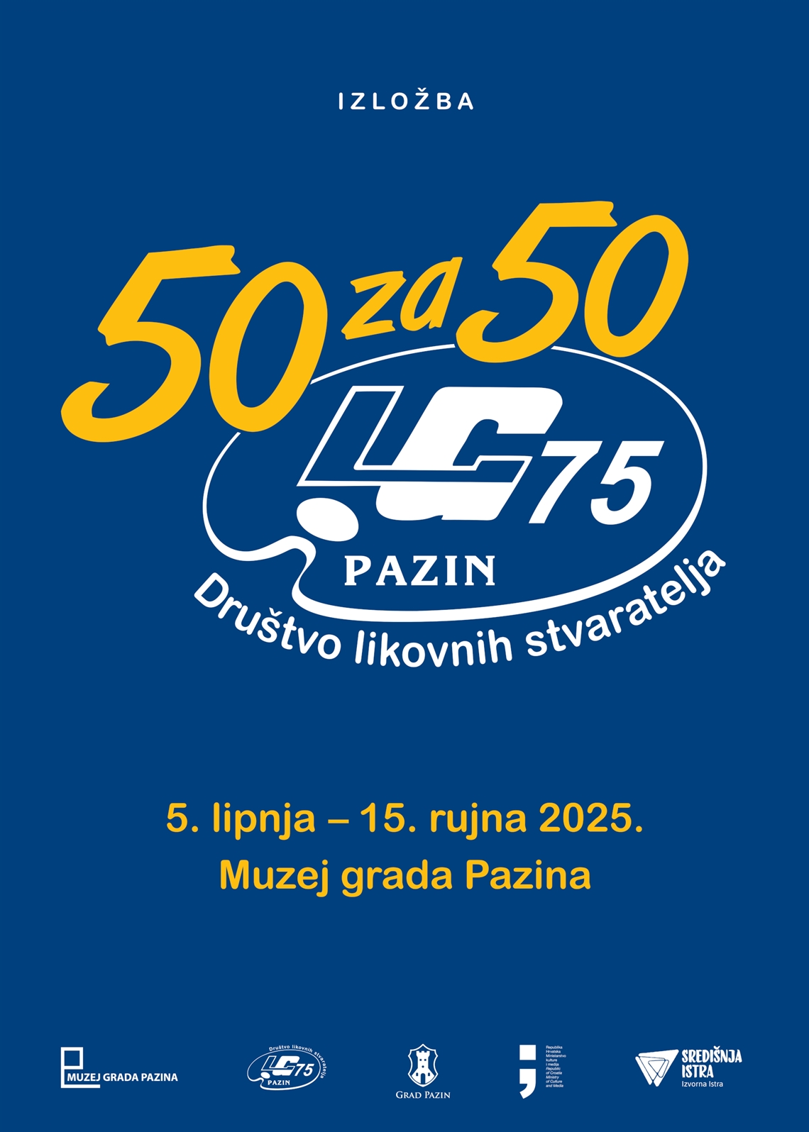 Intuo (dizajner) Primacomm d.o.o. (tisak) 2025. 2025 13738 papir cjelina: š = 50cm;v = 70.7cm Pazin Muzej grada Pazina 50 za 50 50 za 50 LG75 Pazin - Društvo likovnih stvaratelja 5. lipnja - 15. rujna 2025., Muzej grada Pazina digitalni ispis izložba plakat Zbirka muzejskih plakata Plakat za izložbu kojom je 2025. godine u Muzeju grada Pazina obilježena 50. obljetnica izložbe pazinskih slikara-amatera. Izložbom je kroz raznovrsna likovna djela predstavljen razvoj i ključni trenutci Društva likovnih stvaratelja iz Pazina. Kustosica izložbe bila je Maja Zidarić Pilat.