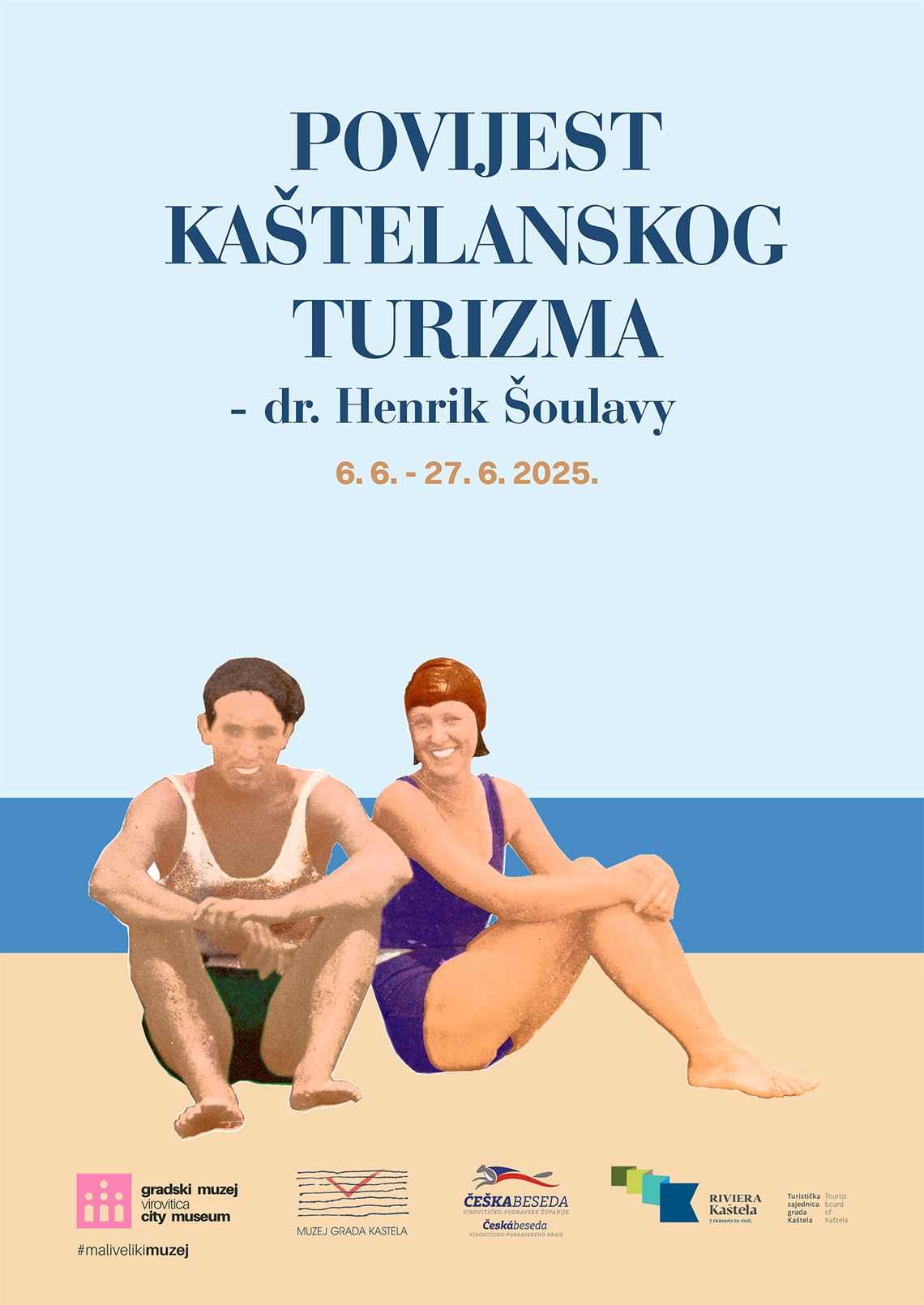 Borbaš, Ivan (dizajner) Grafiti Becker d.o.o. (tisak) 2025. 2025 13751 papir cjelina: š = 50cm;v = 70cm Virovitica Gradski muzej Virovitica Povijest kaštelanskog turizma - dr. Henrik Šoulavy Povijest kaštelanskog turizma - dr. Henrik Šoulavy 6.6. - 27.6.2025. digitalni tisak izložba plakat Zbirka muzejskih plakata Plakat za izložbu “Povijest kaštelanskog turizma – dr. Henrik Šoulavy” u Gradskom muzeju Virovitica, otvorenu u lipnju 2025. godine. Izložba je nastala u suradnji s Muzejom grada Kaštela, Češkom besedom Virovitičko-podravske županije,Turističkom zajednicom grada Kaštela te Rivierom Kaštela. Predstavljen je razvoj turizma u Kaštelima, na što je utjecao i Henrik Šoulavy, liječnik porijeklom iz Češke, koji je ovdje otvorio prvi pansion.