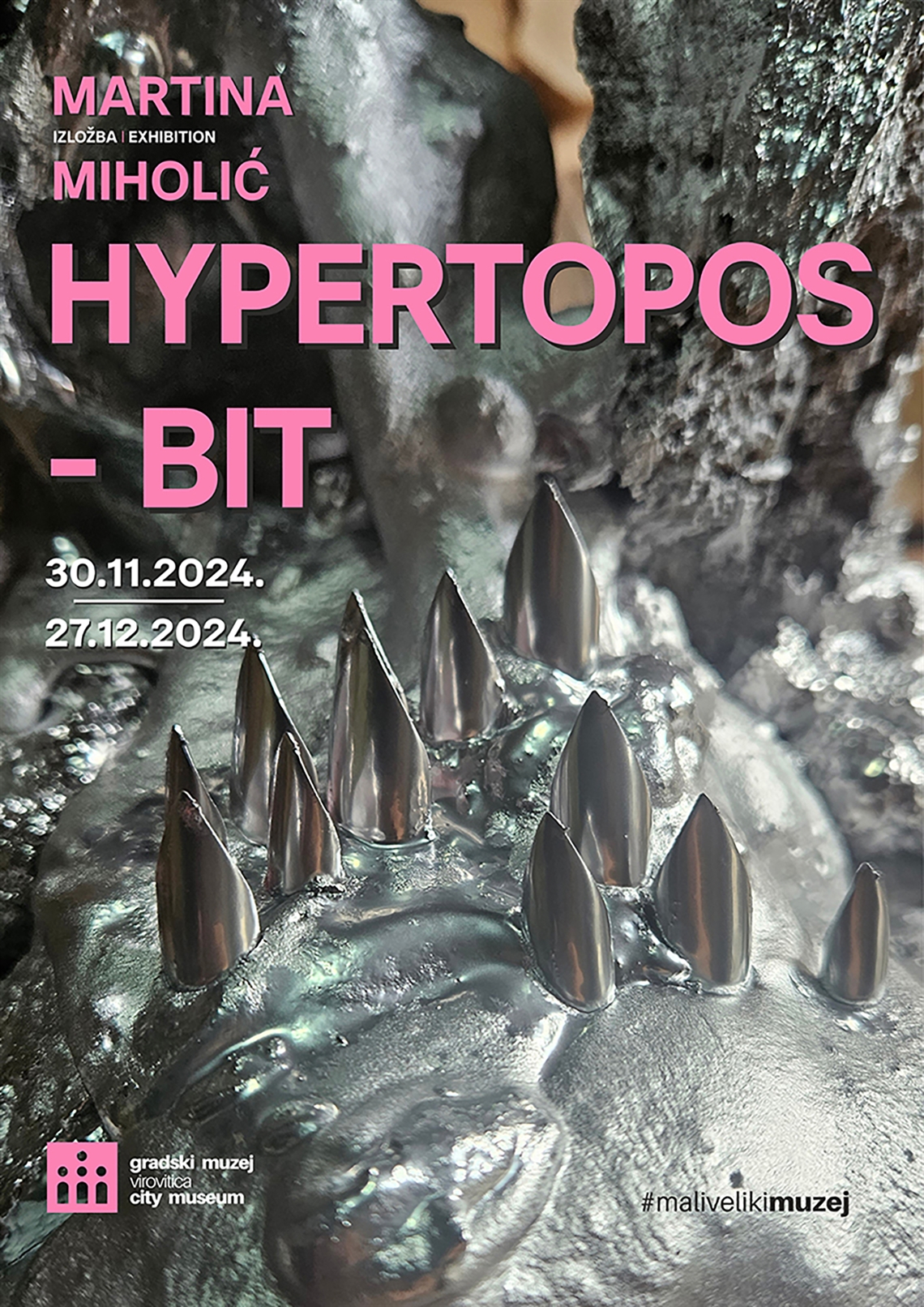 Borbaš, Ivan (dizajner) Grafiti Becker d.o.o. (tisak) 2024. 2024 13758 papir cjelina: š = 50cm;v = 70cm Virovitica Gradski muzej Virovitica Martina Miholić Martina Miholić Hypertopos - bit 30.11.2024. - 27.12.2024. digitalni tisak izložba plakat Zbirka muzejskih plakata Izložba Martine Miholić u Gradskome muzeju Virovitica 2024. godine. Pomoću različitih materijala i medija umjetnica je stvorila instalacije koje predstavljaju distopijske krajolike. Na plakatu se nalazi fotografija dijela jednog izloženog predmeta.