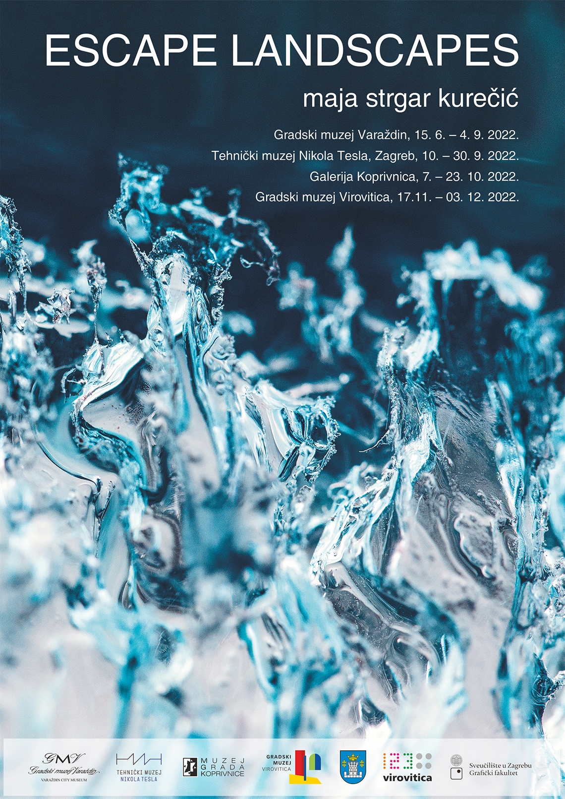 Borbaš, Ivan (dizajner) Grafiti Becker d.o.o. (tisak) 2022. 2022 13761 papir cjelina: š = 50cm;v = 70cm Virovitica Gradski muzej Virovitica Maja Strgar Kurečić Maja Strgar Kurečić Escape Landscapes Gradski muzej Varaždin 15.6. - 4.9.2022.; Tehnički muzej Nikola Tesla, Zagreb, 10. - 30.9.2022.; Galerija Koprivnica, 7. - 23.10.2022.; Gradski muzej Virovitica, 17.11. - 03.12.2022. digitalni tisak izložba plakat Zbirka muzejskih plakata Plakat za izložbu fotografija Maje Strgar Kurečić u Gradskome muzeju Virovitica, nastalu u suradnji s Gradskim muzejom Varaždin, Tehničkim muzejom Nikola Tesla u Zagrebu te Muzejom grada Koprivnice, gdje je izložba prethodno bila postavljena. Na izložbi je bilo izloženo 40 apstraktnih fotografija velikog formata.