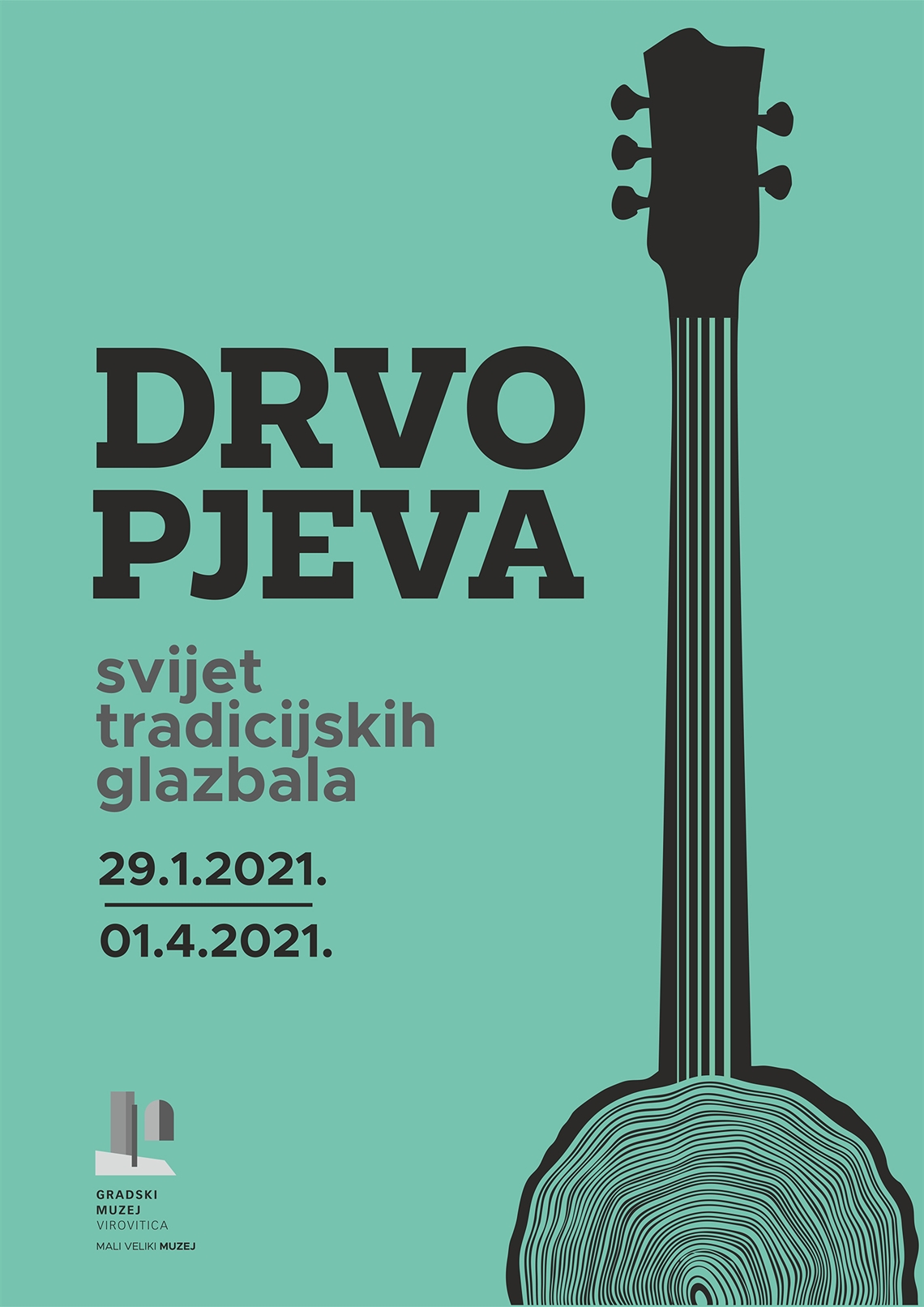 Borbaš, Ivan (dizajner) Grafiti Becker d.o.o. (tisak) 2021. 2021 13762 papir cjelina: š = 50cm;v = 70cm Virovitica Gradski muzej Virovitica Drvo pjeva Drvo pjeva Svijet tradicijskih glazbala 29.1.2021. - 01.4.2021. digitalni tisak izložba plakat Zbirka muzejskih plakata Plakat za izložbu „Drvo pjeva“ u Gradskome muzeju Virovitica 2021. godine. Na izložbi su bila predstavljena široj javnosti poznata i ona manje poznata slavonska i podravska tradicijska glazbala. U svrhu izložbe dio predmeta je prethodno i rekonstruiran.