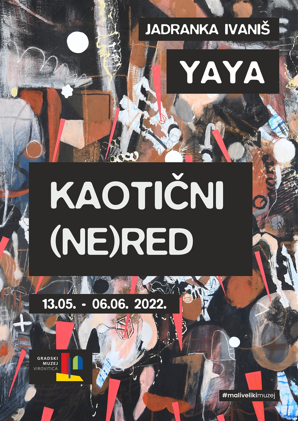 Borbaš, Ivan (dizajner) Grafiti Becker d.o.o. (tisak) 2022. 2022 13763 papir cjelina: š = 50cm;v = 70cm Virovitica Gradski muzej Virovitica Jadranka Ivaniš Yaya Jadranka Ivaniš Yaya Kaotični (ne)red 13.05. - 06.06.2022. digitalni tisak izložba plakat Zbirka muzejskih plakata Plakat za Izložbu Jadranke Ivaniš Yaye „Kaotični (ne)red“ u Gradskome muzeju Virovitica 2022. godine. Izložbom su predstavljene slike i nakit nastali recikliranjem različitih predmeta i materijala.