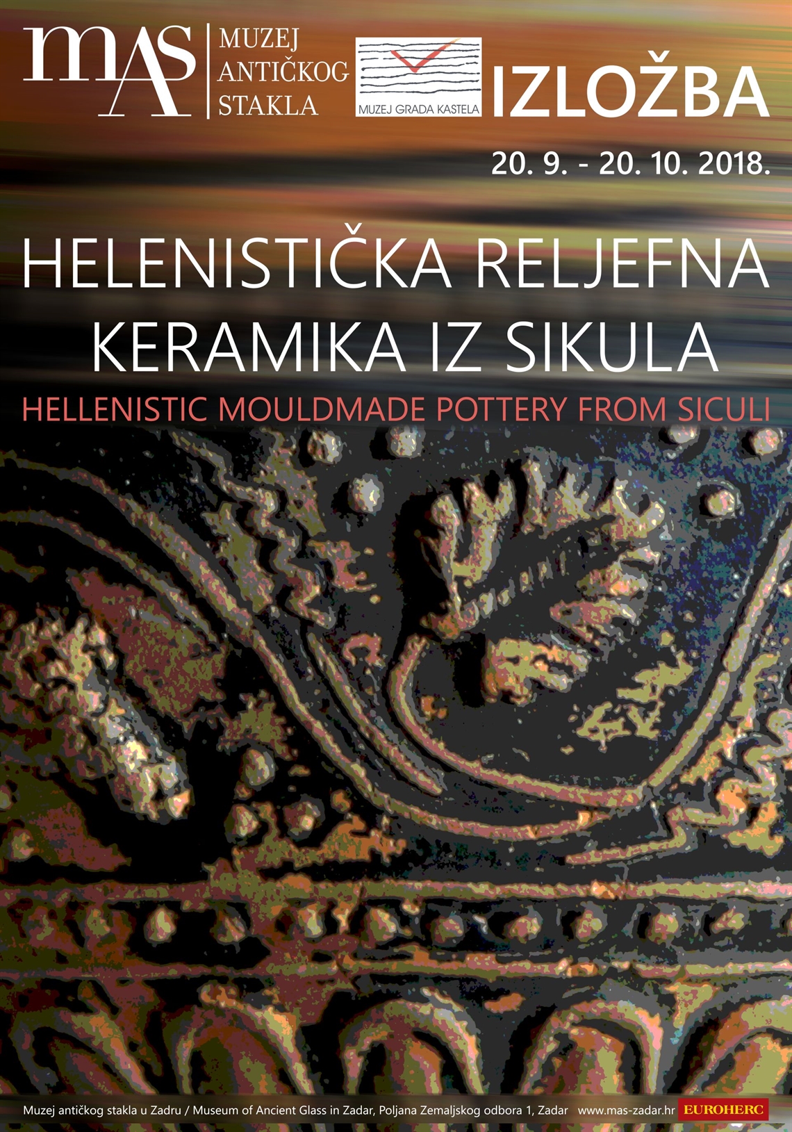 Helenistička reljefna keramika iz Sikula Helenistička reljefna keramika iz Sikula 20.9. - 20.10. 2018. Hellenistic Mouldmade Pottery from Siculi Belevski, Jadranka (dizajner) Muzej antičkog stakla Zadar 2018. digitalni ispis papir cjelina: š = 69.7cm;v = 100cm muzejski plakat plakat (izložba) Zbirka muzejskih plakata 12110 2018 arheologija izložba keramika reljef helenizam Siculi Plakat za izložbu kojom je u Muzeju antičkog stakla u Zadru 2018. godine predstavljena helenistička reljefna keramika iz antičkog nalazišta Sikula na zapadu Kaštelanskog zaljeva. Izložba je nastala u suradnji s Muzejom grada Kaštela. Osnovni pronađeni oblici su posuda za miješanje vina i vode, tzv. krater, te posuda za ispijanje vina, oboje bogato ukrašeni biljnim, životinjskim i geometrijskim motivima izvedenima u reljefu.