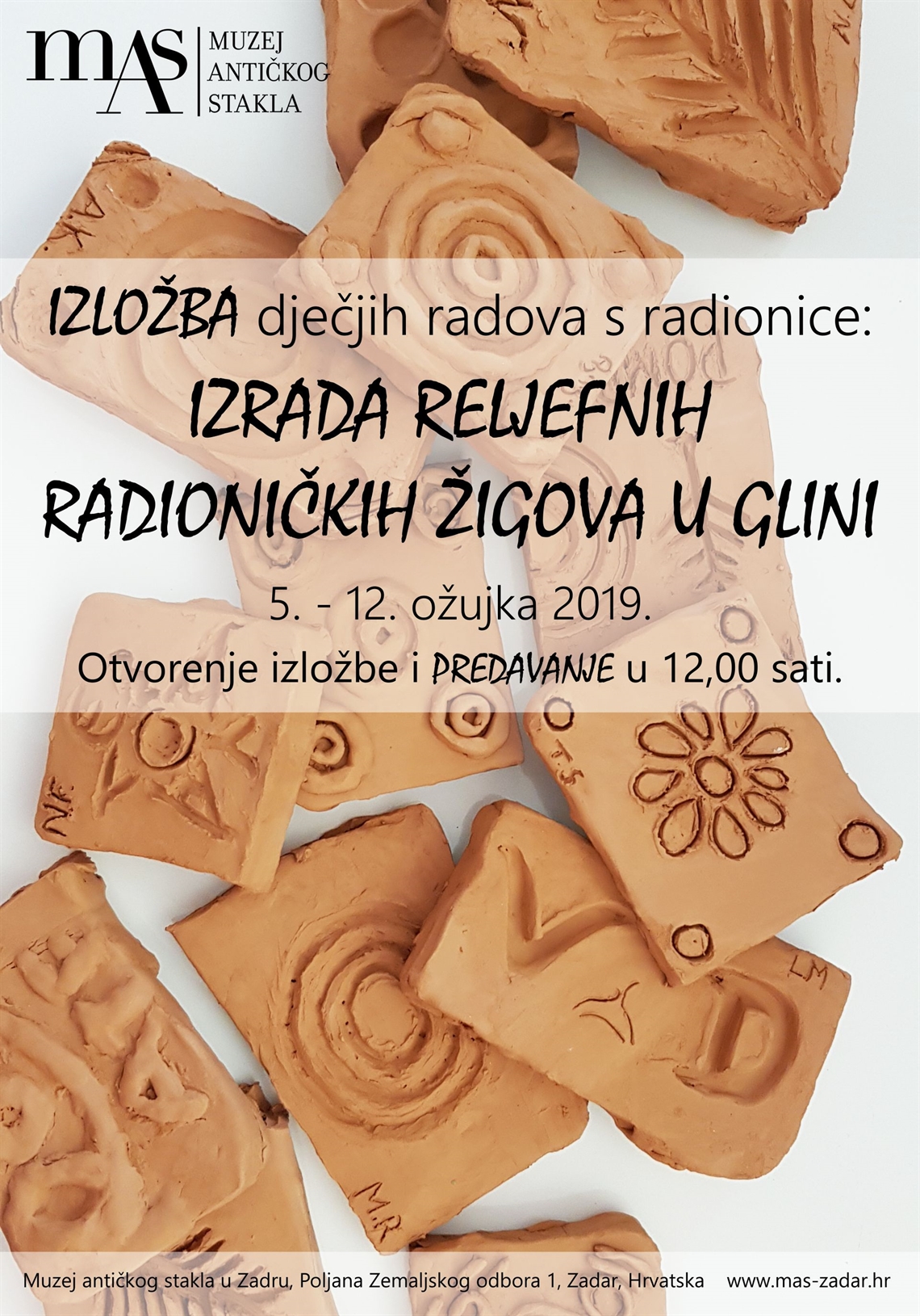 Izrada reljefnih radioničkih žigova u glini Izrada reljefnih radioničkih žigova u glini izložba dječjih radova s radionice otvorenje izložbe i predavanje 5. - 12.3. 2019. Belevski, Jadranka (dizajner) Muzej antičkog stakla Zadar 2019. digitalni ispis papir cjelina: š = 32cm;v = 45cm muzejski plakat plakat (izložba) Zbirka muzejskih plakata 12282 2019 arheologija djeca edukacija izložba keramika predavanje radionica žig Plakat za izložbu ruske akademske slikarice Oksane Veber u Muzeju antičkog stakla u Zadru 2019. godine. Umjetnicu je za izradu izloženih radova nadahnulo antičko staklo svojim motivima, uzorcima i upotrebom. Na plakatu se nalaze dijelovi njezinih slika.