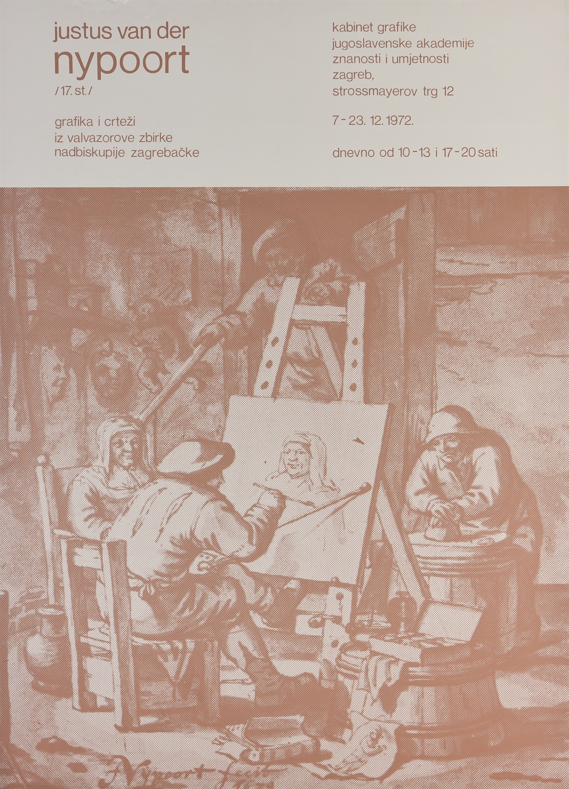 Justus van der Nypoort (17.st.) Justus van der Nypoort (17.st.) 7. - 25. 12. 1972. grafika i crteži iz Valvazorove zbirke Nadbiskupije zagrebačke Picelj, Ivan (dizajner) Kabinet grafike JAZU Zagreb 1972. sitotisak papir cjelina: š = 58cm;v = 80cm plakat Zbirka muzejskih plakata 30 1972 crtež izložba 17. st. Nypoort, Justus van der Valvasorova zbirka Nadbiskupije zagrebačke Vizualni akcent plakata je na reproduciranoj grafici - slikar s modelom u ateljeu (detalj), koja artikulira dvije trećine plakatnog polja. Prikaz je smješten u donjem dijelu plakatnog polja odmaknut od rubova. Gornje polje plakata definiraju informacije u dvije kolumne. U lijevoj kolumni smješteni su naslov i podnaslov hijerarhijski organizirani u više redova s lijevim poravnanjem (umjetnikovo prezime, ime, podnaslov). Sve ostale informacije nalaze se u desnoj kolumni (mjesto događanja, vrijeme događanja, vrijeme rada izložbenog prostora). Podloga plakata sive je boje, a grafika i slova smeđe.