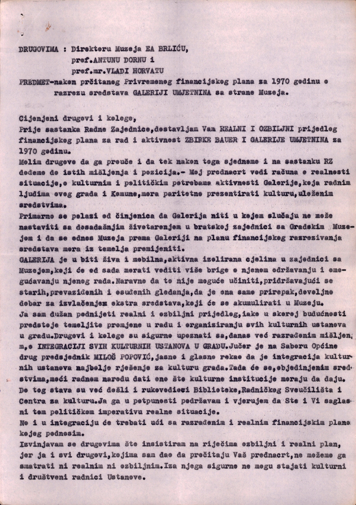 Predstavka u vezi s razrezom financijskog plana za 1970. koji se odnosi na Galeriju umjetnina Vukovar Bauer, Antun (primatelj) Dorn, Antun (primatelj) Gradski muzej Vukovar (primatelj) Brlić, Ante Eugen (primatelj) Horvat, Vlado (primatelj) Vukovar Vukovar 1970. dopis Arhiv A-4595 1970 financije 1970. Vukovar Gradski muzej Vukovar Galerija umjetnina (Vukovar) Branko Mrkušić, kustos zbirke Bauer i Galerije umjetnina, šalje predstavku navedenim osobama iz Gradskog muzeja Vukovar s "Realnim i ozbiljnim prijedlogom financijskog plana" nezadovoljan dodijeljenim sredstvima za Galeriju umjetnina i Zbirku Bauer.