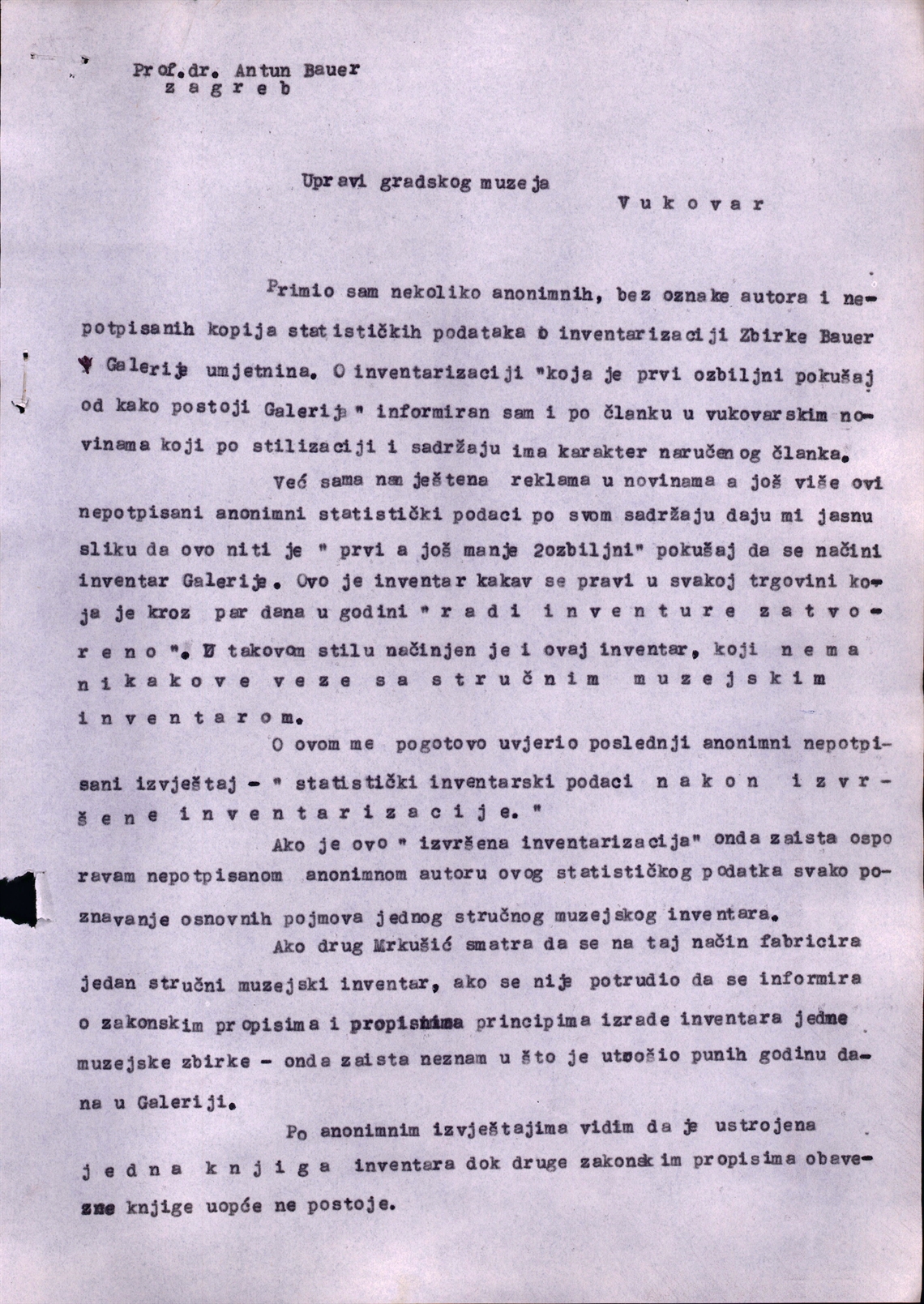 Pitanja i primjedbe u vezi sa stanjem u Galeriji umjetnina i Zbirci Bauer Mrkušić, Branko (primatelj) Zagreb 1970. pismo Arhiv A-4613 1970 inventarizacija 1970. Gradski muzej Vukovar Galerija umjetnina (Vukovar) Antu Bauer je Branku Mrkušiću, kustosu Zbirke Bauer u Galeriji umjetnina postavio nekoliko pitanja i stavio primjedbe u vezi s vođenjem Galerije i Zbirke, a naročito ga interesira kako su se izgubili inventarski omoti jer je to "legitimacija stručnosti muz. ustanove". upućuje ga da je inventarizaciju nužno napraviti.