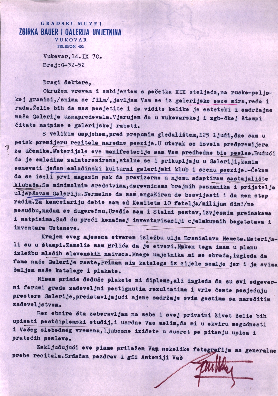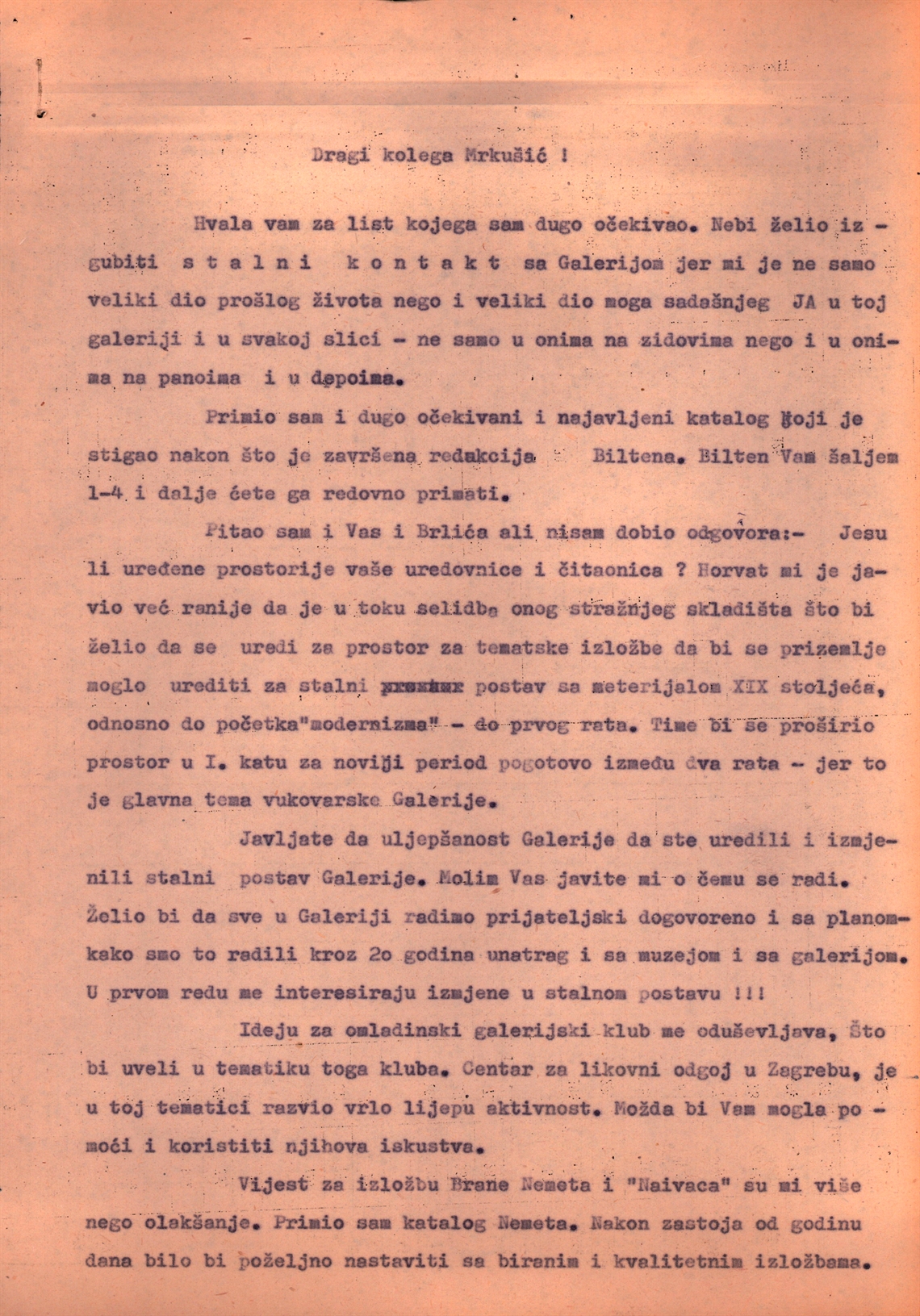 Aktivnosti Galerije umjetnina u Vukovaru Bauer, Antun (primatelj) Vukovar 1970. pismo Arhiv A-4614 1970 izložba inventarizacija recital 1970. Vukovar Gradski muzej Vukovar Galerija umjetnina (Vukovar) Branko Mrkušić javlja što je sve uradio priredio i planirao kao aktivnosti u Galeriji, a između ostaloga "recital narodne poezije" u planu mu je ozložba ulja Branislava Nemeta, pa tek onda ima namjeru prići inventarizaciji. Interesira ga i mogućnost postdiplomskog studija.