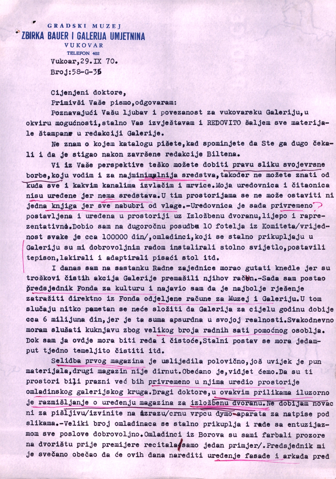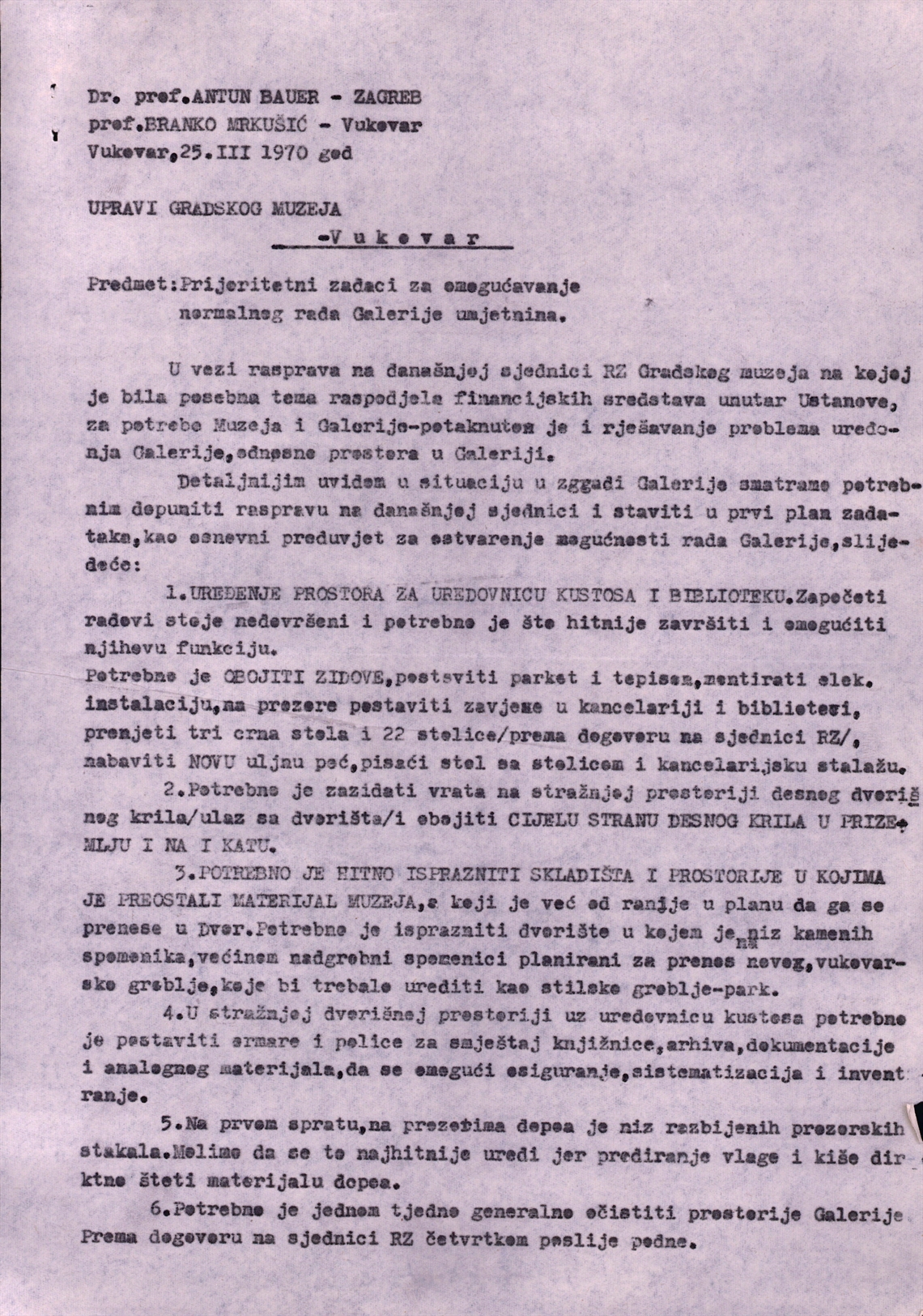 Omogućavanje normalnog rada Galerije umjetnina Gradski muzej Vukovar (primatelj) Zagreb 1970. dopis Arhiv A-4626 1970 građevinski radovi sanacija muzeja 1970. Vukovar Gradski muzej Vukovar Galerija umjetnina (Vukovar) Antun Bauer-donator Zbirke Bauer i Branko Mrkušić, kustos zbirke Bauer traže od Uprave Gradskog muzeja Vukovar stvaranje uvjeta za: uređenje prostora za uredovnicu kustosa i biblioteku u stražnjoj dvorišnoj prostoriji, nabaviti ormare, popraviti prozore, otvoriti poštanski pretinac.