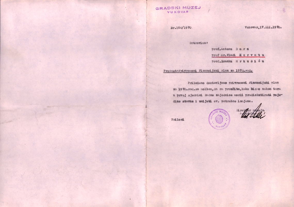 Privremeni financijski plan Gradskog muzeja Vukovar za 1970. god Bauer, Antun (primatelj) Mrkušić, Branko (primatelj) Vukovar 1970. dopis Arhiv A-4628 1970 financijski plan 1970. Vukovar Gradski muzej Vukovar Gradski muzej Vukovar šalje Antunu Baueru, donatoru i kustosu Zbirke Bauer i Branku Mrkušiću privremeni financijski plan za 1970. s molbom da na sjednici iznesu svoje prijedloge.
