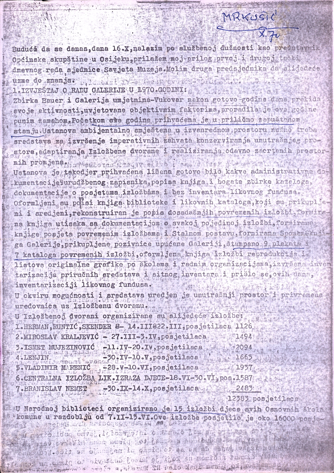 Izvještaj o radu Galerije umjetnina i Zbirke Bauer Muzejski dokumentacijski centar (primatelj) Gradski muzej Vukovar (primatelj) Vukovar 1970. izvještaj Arhiv A-4630 1970 posjetitelji izvješće o radu inventarizacija 1970. Vukovar Gradski muzej Vukovar Galerija umjetnina (Vukovar) Zbirka Bauer Branko Mrkušić prilaže za sjednicu Savjeta gradskog muzeja Vukovar pismeni Izvještaj o radu Galerije umjetnina i Zbirke Bauer Vukovar, budući da je odsutan. U izvještaju navodi obavljene poslove i aktivnosti i uvjete u kojima radi.