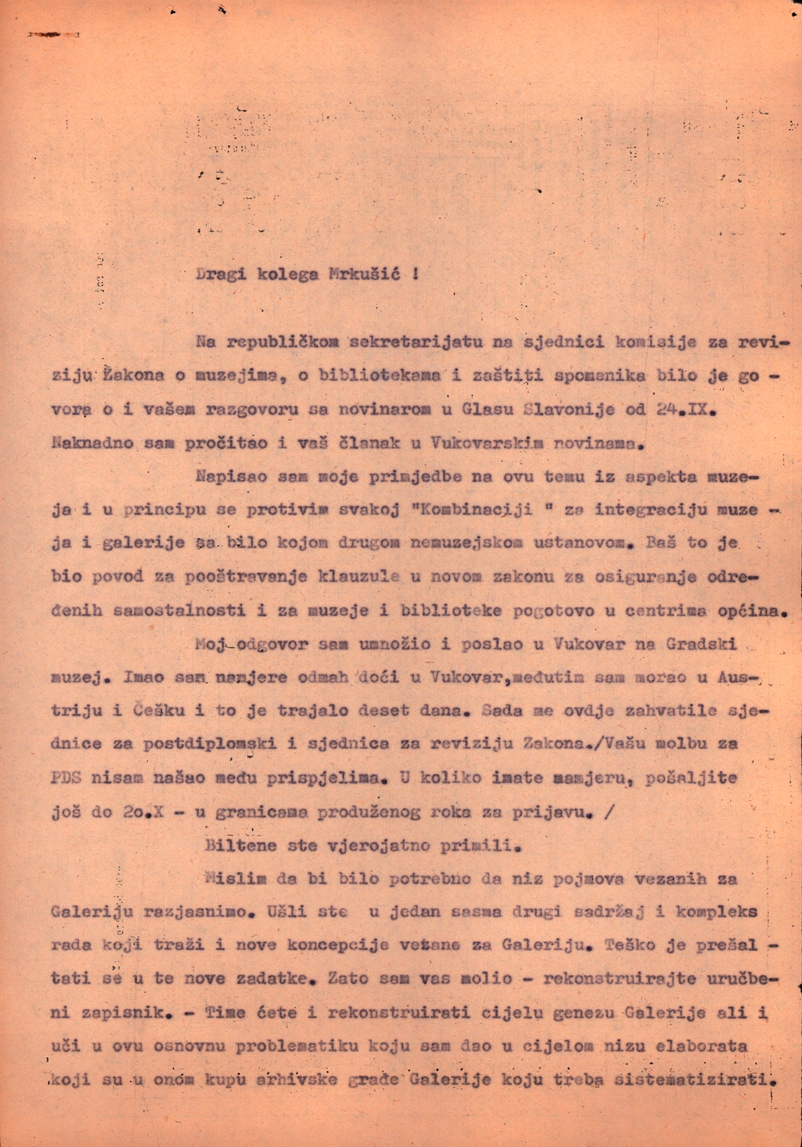 Odgovor i primjedbe na tekst o integraciji muzeja s nemuzejskim ustanovama Gradski muzej Vukovar (primatelj) Mrkušić, Branko (primatelj) Zagreb 1970. pismo Arhiv A-4633 1970 integracija muzeja primjedbe na integraciju muzeja 1970. Vukovar Gradski muzej Vukovar Antun Bauer u pismu Branku Mrkušiću odgovara na novinski napis iz Glasa Slavonije u kojemu je Mrkušić dao izjavu o integraciji muzejskih ustanova, kojoj se Bauer izričito protivi. Dodaje i primjedbe na o pojavi vlage u Galeriji i ističe važnost inventarizacije. Također naglašava da se *protivi" promjenama u postavu.