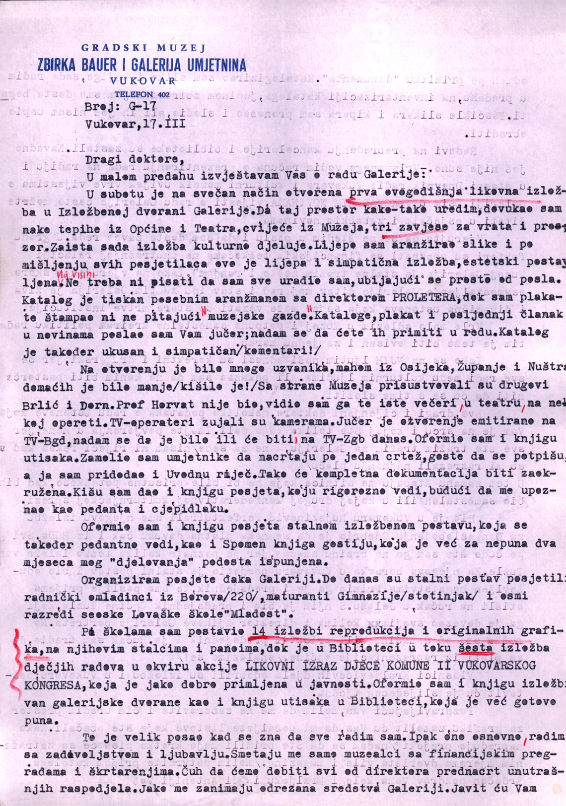 Izvještaj o radu Galerije umjetnina Vukovar Bauer, Antun (primatelj) Vukovar 1970. dopis Arhiv A-4642 1970 izvješće o radu 1970. Vukovar Gradski muzej Vukovar Galerija umjetnina (Vukovar) Branko Mrkušić kustos Zbirke Bauer i Galeriije umjetnina u poluprivatnom tonu piše pismo-izvještaj o radu galerije , kako je priredio izložbu od koga je pozajmio tepihe, tko je sve došao, a tko nije i sl. gdje je objavljeno i što.
