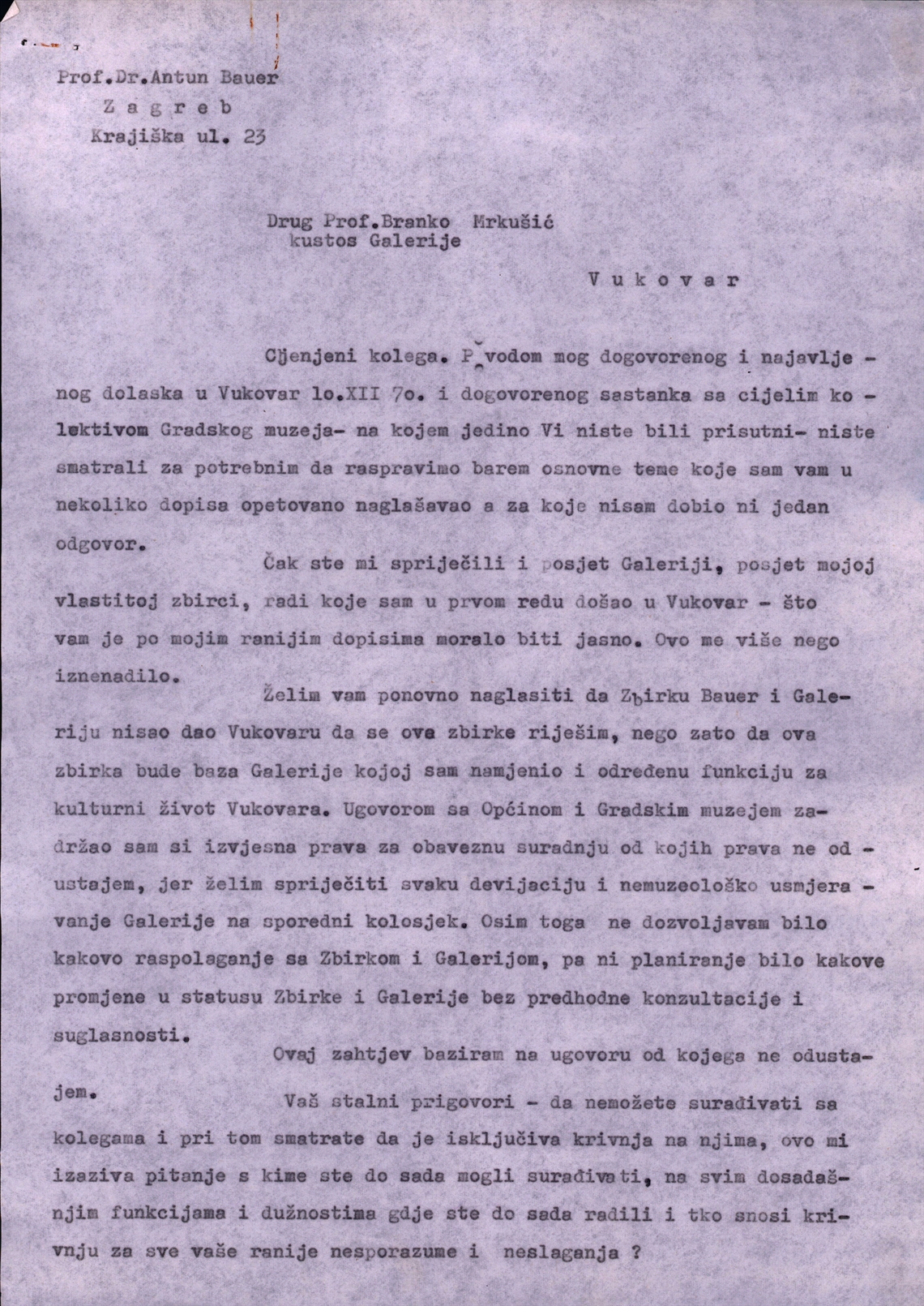 Prigovori na odnos prema Zbirci Bauer i donatoru Mrkušić, Branko (primatelj) Zagreb 1970. pismo Arhiv A-4646 1970 prigovor na rad 1970. Vukovar Gradski muzej Vukovar Zbirka Bauer Antun Bauer, direktor Muzejskog dokumentacijskog centra i donator Zbirke Bauer piše prigovor voditelju i kustosu Branku Mrkušiću u Vukovaru, a prigovor se odnosi na njegovo neodgovorno ponašanje, njegovu nesuradnju s kolegama u Muzeju i s Bauerom kao donatorom i traži odgovor, odgovorost i najavljuje prekid suradnje.