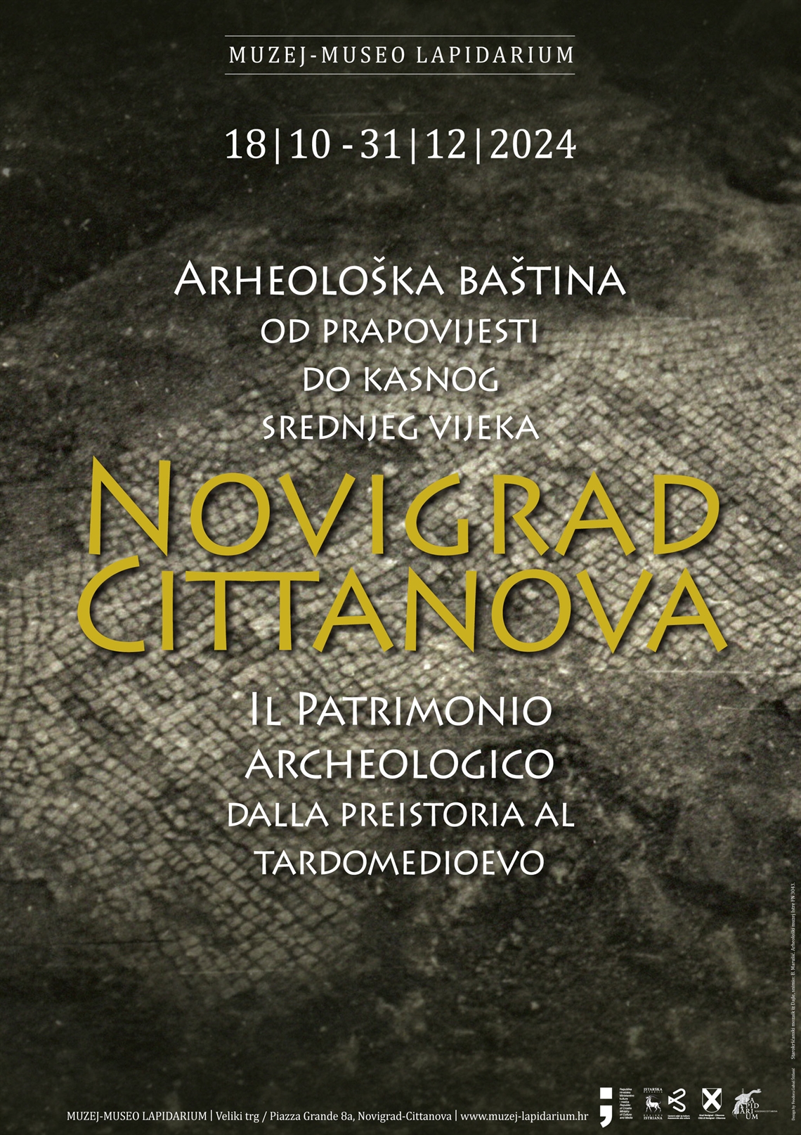 Gubaš Štifanić, Fedora (dizajner) Gušt dizajn (dizajner) Marušić, Branko (fotograf) Simbol Grafika (tisak) 2024. 2024 13822 papir cjelina: š = 48cm;v = 67.5cm Karigador Novigrad (Cittanova) Pula Muzej - Museo Lapidarium Arheološka baština od prapovijesti do kasnog srednjeg vijeka Arheološka baština od prapovijesti do kasnog srednjeg vijeka Novigrad Il patrimonio archeologico dalla preistoria al tardomedioevo Cittanova 18.10. - 31.12.2024. Muzej - Museo Lapidarium digitalni tisak izložba plakat Zbirka muzejskih plakata Plakat za izložbu u Muzeju - Museo Lapidarium otvorenu u listopadu 2024. godine kojom su obuhvaćena arheološka istraživanja i nalazi na novigradskom području od kraja 19. stoljeća to danas. Izloženi predmeti potječu iz ovoga muzeja, ali su i posuđeni su iz drugih ustanova – Arheološkog muzeja Istre, Muzeja grada Umaga i Muzeja antikviteta „J. J. Winckelmann“ iz Trsta. Kustosica izložbe bila je Anika Mijanović Simić. Na plakatu se nalazi fotografija Branka Marušića iz fundusa Arheološkog muzeja Istre.