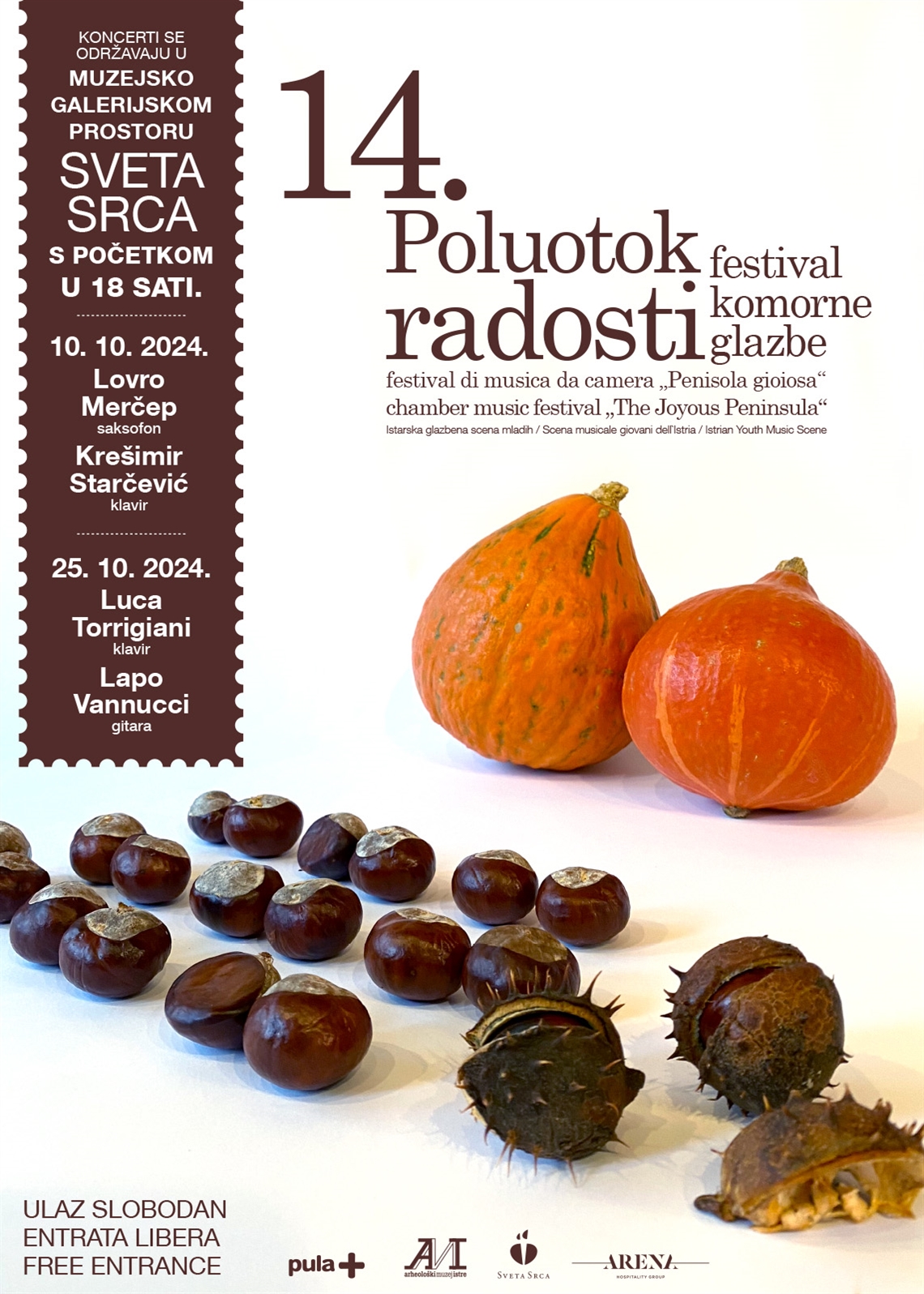 Juhas, Vjeran (dizajner) MPS (tisak) 2024. 2024 13939 papir cjelina: š = 48cm;v = 68cm Makarska Pula Arheološki muzej Istre 14. Poluotok radosti - festival komorne glazbe 14. Poluotok radosti - festival komorne glazbe Chamber music festival „The Joyous Peninsula“ Festival di musica da camera „Penisola gioiosa“ Istarska glazbena scena mladih Istrian Youth Music Scene Scena musicale giovani dell’Istria Koncerti se održavaju u muzejsko-galerijskom prostoru Sveta srca s početkom u 18 sati. 10.10.2024. - Lovro Merčep – saksofon, Krešimir Starčević – klavir / 25.10.2024. - Luca Torrigiani – klavir, Lapo Vannucci – gitara offset koncert plakat Zbirka muzejskih plakata Plakat povodom 14. po redu festival komorne glazbe u Muzejsko-galerijskom prostoru Sveta srca pod nazivom “Poluotok radosti”. Festival je održan u listopadu 2024. godine, a na plakatu s enalaze jesenski plodovi - kesteni i tikve.