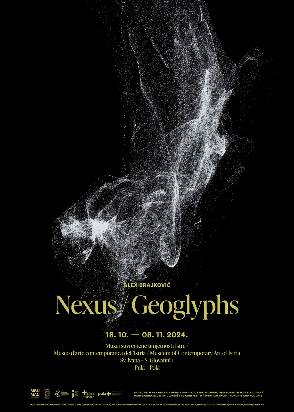 Brajković, Alex (fotograf) Nalić, Tihana (dizajner) Technic team d.o.o. (tisak) 2024. 2024 13991 papir cjelina: š = 70cm;v = 100cm Galižana Pula Muzej suvremene umjetnosti Istre – Museo d' arte contemporanea dell' Istria Alex Brajković Alex Brajković Muzej suvremene umjetnosti Istre, Sv. Ivana 1, Pula Museo d'arte contemporanea dell'Istria, S. Giovanni 1, Pola Nexus / Geoglyphs 18.10. - 08.11.2024. digitalni tisak izložba plakat Zbirka muzejskih plakata Plakat za izložbu Alexa Brajkovića, multimedijskog umjetnika i glazbenika, otvorenu u listopadu 2025. u Muzeju suvremene umjetnosti Istre. Umjetnik je kroz multimedijsku instalaciju “Nexus” i seriju slika “Geoglyphs” omogućio posjetiteljima da istraže interakciju čovjeka sa svemirom. Kustosica izložbe je Ketrin Milićević Mijošek.