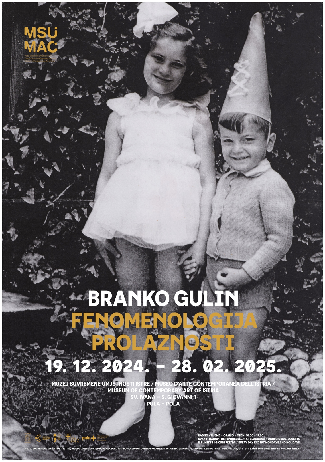 Nalić, Tihana (dizajner) Technic team d.o.o. (tisak) 2024. 2024 13995 papir cjelina: š = 50cm;v = 70cm Pula Muzej suvremene umjetnosti Istre – Museo d' arte contemporanea dell' Istria Branko Gulin Branko Gulin Fenomenologija prolaznosti 19.12.2024. - 28.02.2025. Muzej suvremene umjetnosti Istre, Sv. Ivana 1, Pula Museo d'arte contemporanea dell'Istria, S. Giovanni 1, Pola digitalni tisak izložba plakat Zbirka muzejskih plakata Plakat za izložbu vizualnog umjetnika Branka Gulina (1953.) otvorenu u Muzeju suvremene umjetnosti Istre krajem 2024. godine. Ovo je njegova prva samostalna izložba u ovome muzeju, a ima multimedijski i multidisciplinarni karakter. Izloženi su i njegovi ručno rađeni plakati. Kustosica izložbe je Ketrin Milićević Mijošek. Na plakatu se nalazi fotografija iz autorove osobne arhive.